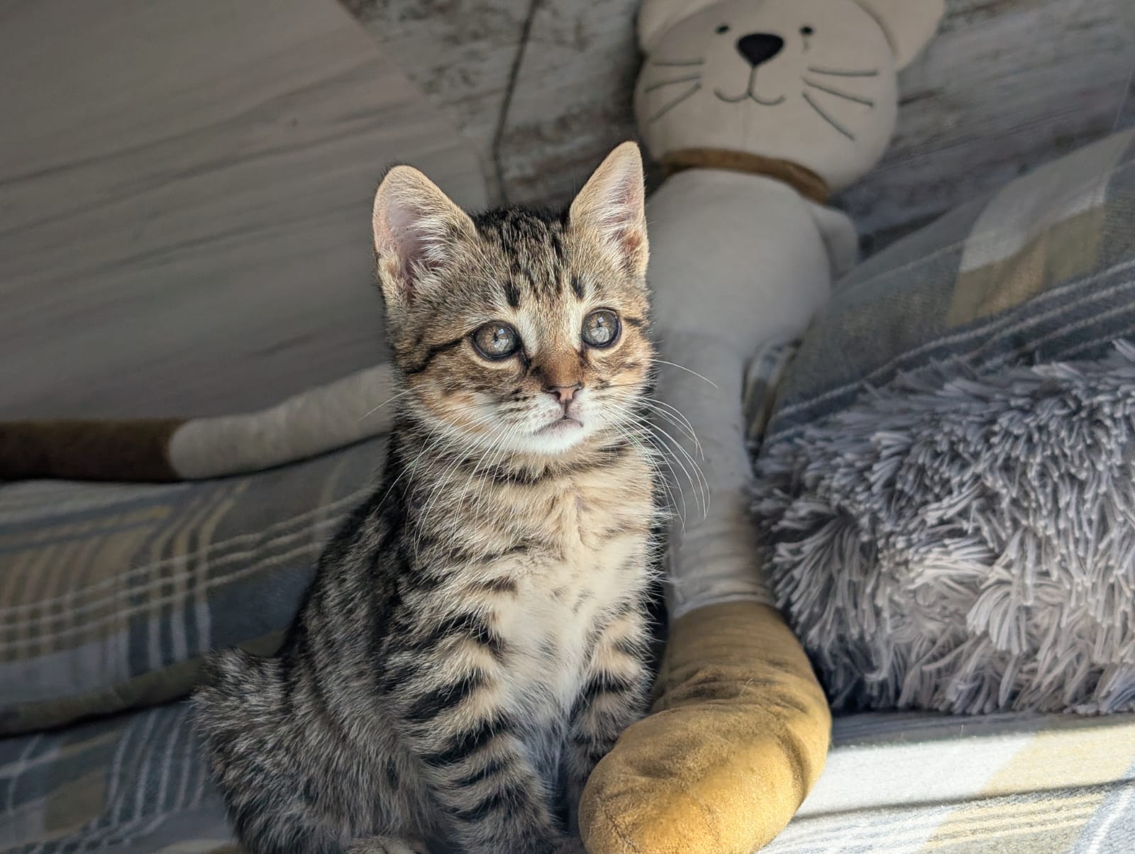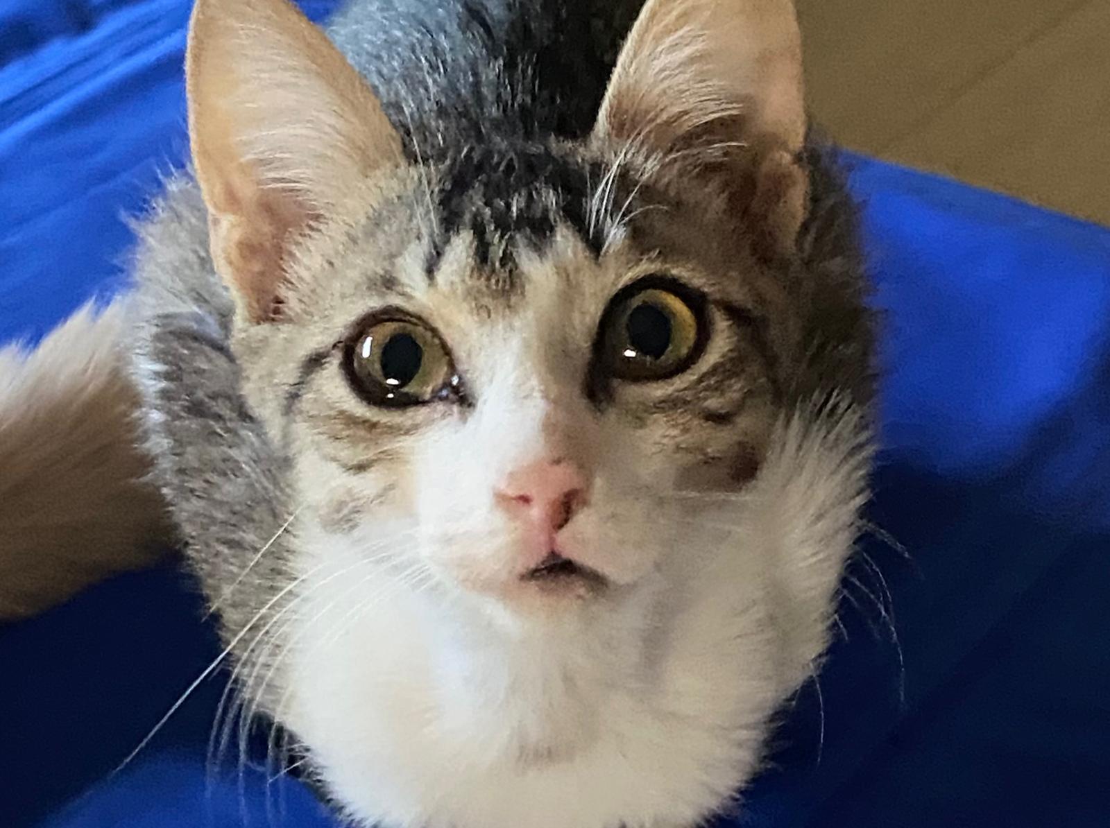 I’m a tiny kitten who had a bit of a rough start. Someone found me all alone in a box at the side of the road. I was feeling poorly then — I had a chest infection, but with some love and medicine, I’m all better now.