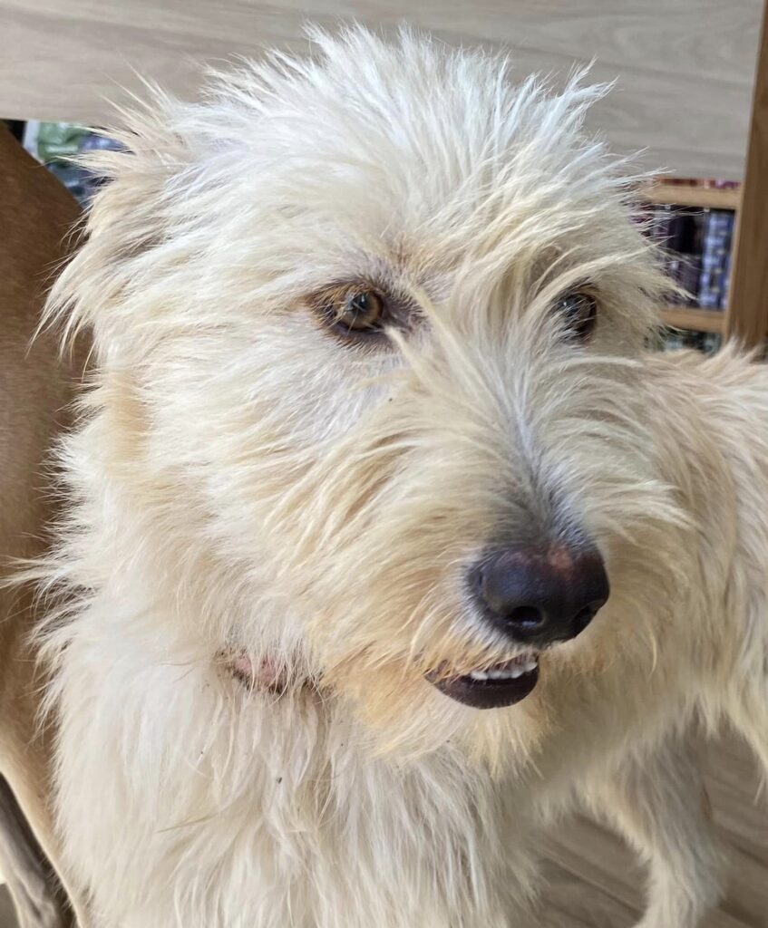It was noticed she had a large matted scabby area on her throat, once the hair had been cut away it revealed she had puncture wounds that had since healed probably a bite from another dog so the area was cleaned.
